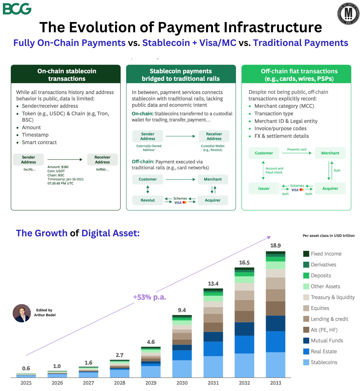 Most on-chain activity is still financial infrastructure — trading, liquidity, positioning. 𝐏𝐚𝐲𝐦𝐞𝐧𝐭𝐬 are real, but they're a minority and digital assets overall are projected to grow ~53% per year through 2033.