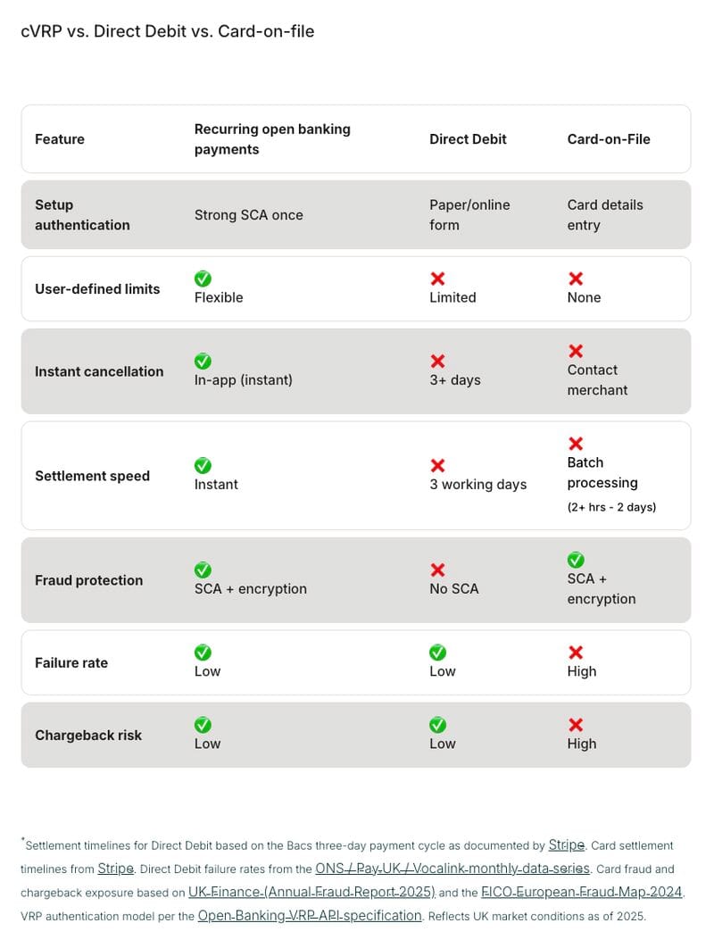🇬🇧 Recurring payments are evolving as open banking gains momentum, with Variable Recurring Payments (VRP) and commercial VRP (cVRP). Platforms like Yapily highlight how these account-to-account payments offer lower costs, instant settlement, and greater control, positioning open banking as a key driver of the next generation of recurring payment infrastructure.