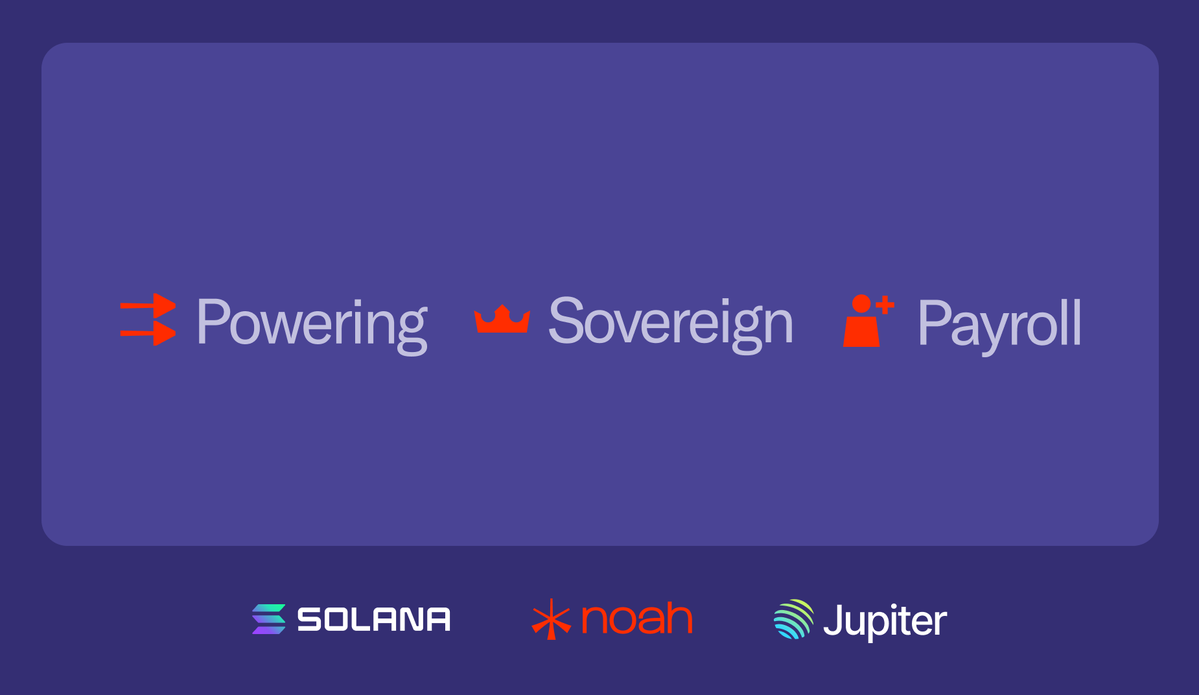 ➡️ Powering Sovereign Payroll; Jupiter's DeFi infrastructure meets the world's workforce by Noah. Noah has built an end-to-end stablecoin payments system using Solana for fast, low-cost settlement, combined with fiat rails for global collections and payouts. By integrating with Jupiter, the solution enables users to instantly access swaps, yield, and off-ramps, creating a compliant, scalable model for payroll, remittances, and cross-border payments.