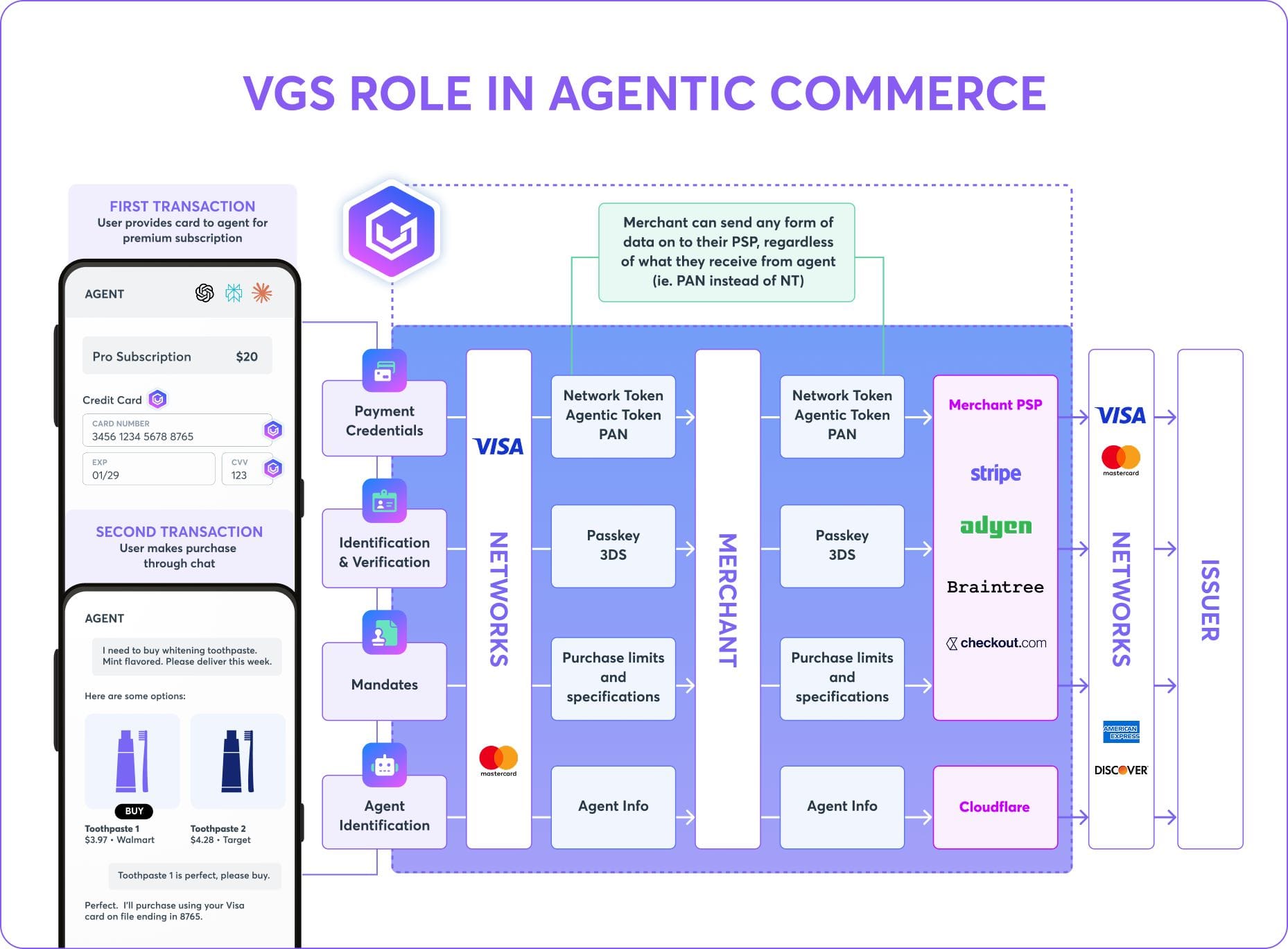 VGS sits in the transaction flow (with agent permission) to capture the necessary data elements (agent ID, verification, consumer mandates, and payment credentials) and securely deliver them downstream to both merchants and PSPs.