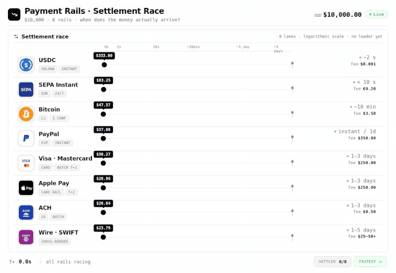 USDC: ~2 seconds. Wire transfers: ~5 days.