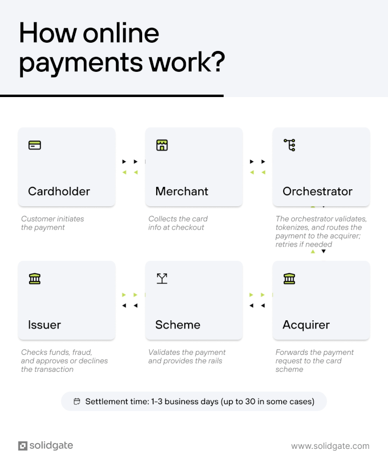 ๐ ๐ง๐ต๐ฒ ๐ฃ๐ฎ๐๐บ๐ฒ๐ป๐ ๐๐น๐ผ๐: Cardholder โ Merchant โ Orchestrator โ Acquirer โ Scheme โ Issuer โ Scheme โ Acquirer โ Orchestrator โ Merchant